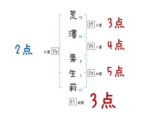 外運![]() | 荒澤果生莉さんの外運は26画の2つ星!波瀾万丈かも。信頼できる人を大事にしましょう。 生活面を象徴する運勢です。外部から受ける影響力を表し、結婚運、家庭運や職場、環境への順応性を表します。 |