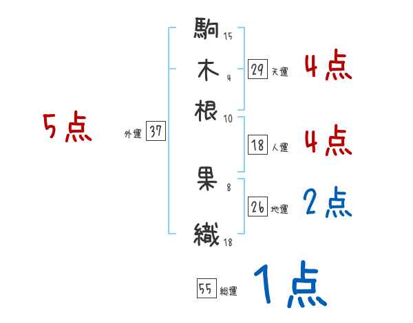 天運![]() | 駒木根果織さんの天運は29画の4つ星!完全主義で才能がある。厳格な心の持ち主。 家系が持つ宿命的な運勢を表します。祖先から受け継いだ苗字ですので自分の力が及びません。家柄を象徴します。 |