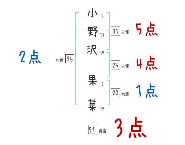 外運![]() | 小野沢果菜さんの外運は26画の2つ星!波瀾万丈かも。信頼できる人を大事にしましょう。 生活面を象徴する運勢です。外部から受ける影響力を表し、結婚運、家庭運や職場、環境への順応性を表します。 |
