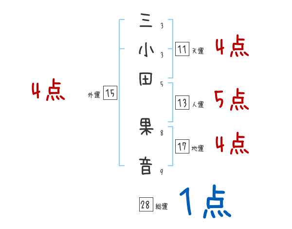 天運![]() | 三小田果音さんの天運は11画の4つ星!着実に富や地位を得る幸運な人生。 家系が持つ宿命的な運勢を表します。祖先から受け継いだ苗字ですので自分の力が及びません。家柄を象徴します。 |