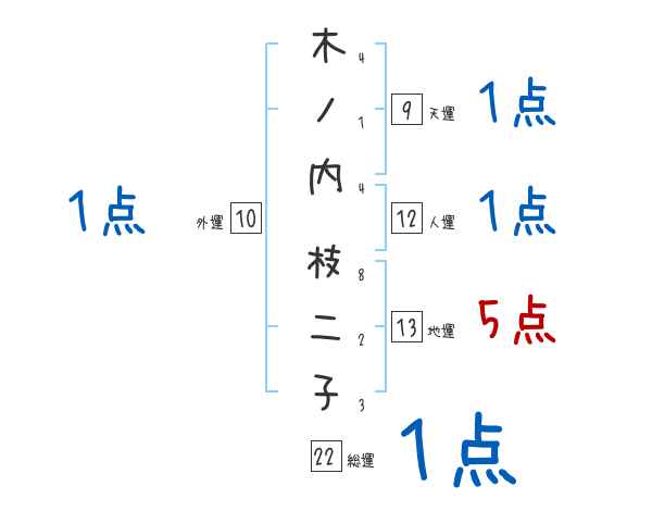 総運![]() | 木ノ内枝二子さんの総運は22画の1つ星!努力することが苦手ないっぽう手先が器用。芸術性にも優れる。 あなたの人生を表す1番重要な運勢です。生涯を通じて影響する総合運となり、主に50歳以降の晩年期に影響を及ぼします。 |