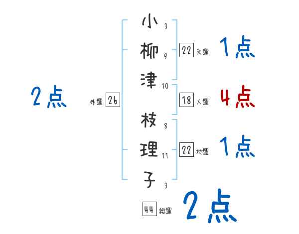 外運![]() | 小柳津枝理子さんの外運は26画の2つ星!波瀾万丈かも。信頼できる人を大事にしましょう。 生活面を象徴する運勢です。外部から受ける影響力を表し、結婚運、家庭運や職場、環境への順応性を表します。 |