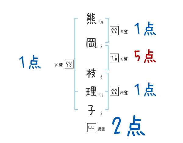 外運![]() | 熊岡枝理子さんの外運は28画の1つ星!家庭環境に注意。スポーツで活躍できる能力があるかも。 生活面を象徴する運勢です。外部から受ける影響力を表し、結婚運、家庭運や職場、環境への順応性を表します。 |