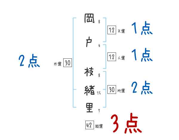天運![]() | 岡戸枝緒里さんの天運は12画の1つ星!簡単な失敗で諦めてしまいやすいかも。着実に行動すると良いでしょう。 家系が持つ宿命的な運勢を表します。祖先から受け継いだ苗字ですので自分の力が及びません。家柄を象徴します。 |