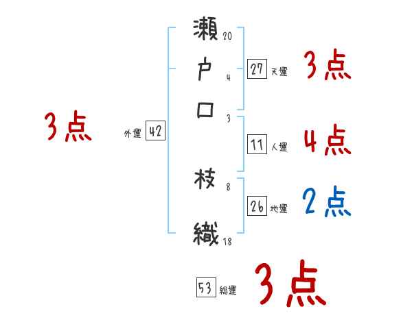 外運![]() | 瀬戸口枝織さんの外運は42画の3つ星!病気に注意。多芸であるが消極的でおとなしい。 生活面を象徴する運勢です。外部から受ける影響力を表し、結婚運、家庭運や職場、環境への順応性を表します。 |