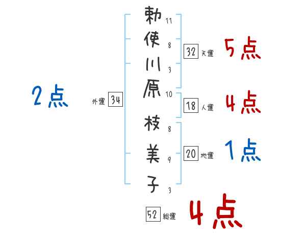天運![]() | 勅使川原枝美子さんの天運は32画の5つ星!柔軟性があり成功する。チャンスが多く金運が良い。 家系が持つ宿命的な運勢を表します。祖先から受け継いだ苗字ですので自分の力が及びません。家柄を象徴します。 |