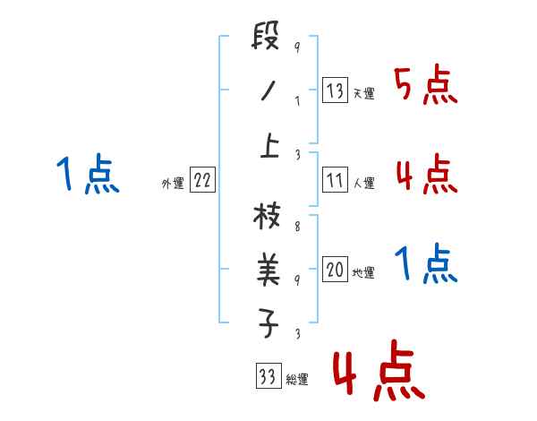 外運![]() | 段ノ上枝美子さんの外運は22画の1つ星!努力することが苦手ないっぽう手先が器用。芸術性にも優れる。 生活面を象徴する運勢です。外部から受ける影響力を表し、結婚運、家庭運や職場、環境への順応性を表します。 |