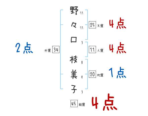 外運![]() | 野々口枝美子さんの外運は34画の2つ星!独創性に優れるが、自尊心が強く災難に注意しましょう。 生活面を象徴する運勢です。外部から受ける影響力を表し、結婚運、家庭運や職場、環境への順応性を表します。 |