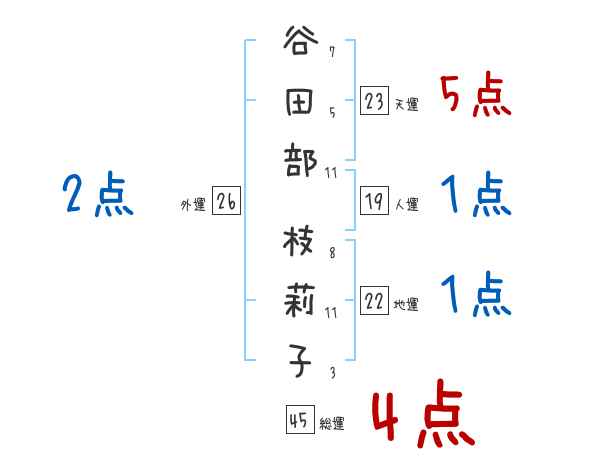 外運![]() | 谷田部枝莉子さんの外運は26画の2つ星!波瀾万丈かも。信頼できる人を大事にしましょう。 生活面を象徴する運勢です。外部から受ける影響力を表し、結婚運、家庭運や職場、環境への順応性を表します。 |