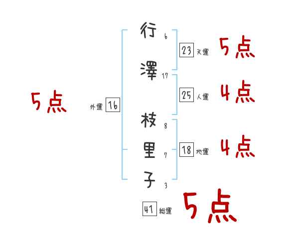 外運![]() | 行澤枝里子さんの外運は16画の5つ星!人望が厚く大きく発展する。逆転成功が見える。 生活面を象徴する運勢です。外部から受ける影響力を表し、結婚運、家庭運や職場、環境への順応性を表します。 |