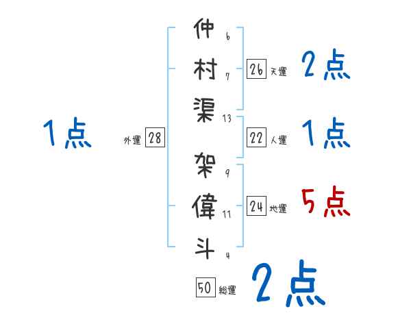 天運![]() | 仲村渠架偉斗さんの天運は26画の2つ星!波瀾万丈かも。信頼できる人を大事にしましょう。 家系が持つ宿命的な運勢を表します。祖先から受け継いだ苗字ですので自分の力が及びません。家柄を象徴します。 |