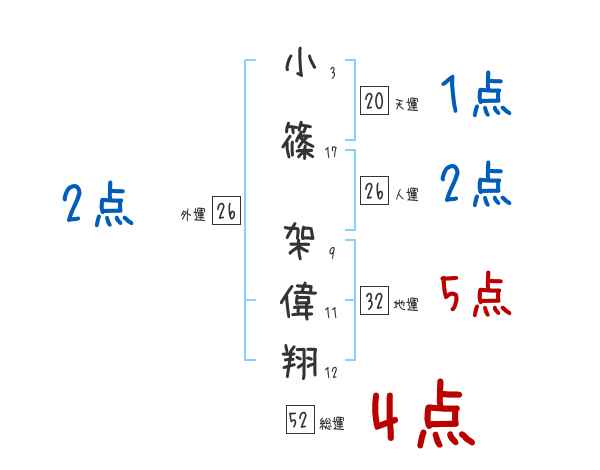 外運![]() | 小篠架偉翔さんの外運は26画の2つ星!波瀾万丈かも。信頼できる人を大事にしましょう。 生活面を象徴する運勢です。外部から受ける影響力を表し、結婚運、家庭運や職場、環境への順応性を表します。 |