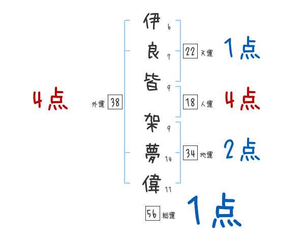 外運![]() | 伊良皆架夢偉さんの外運は38画の4つ星!温厚な性格で技術的な才能を発揮する。職人的な仕事に向いている。 生活面を象徴する運勢です。外部から受ける影響力を表し、結婚運、家庭運や職場、環境への順応性を表します。 |