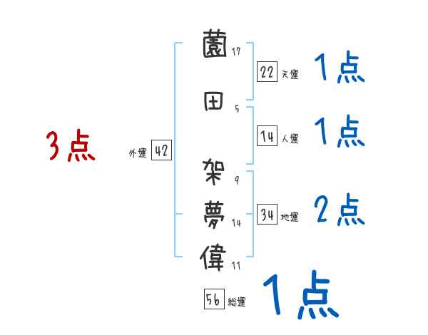 外運![]() | 薗田架夢偉さんの外運は42画の3つ星!病気に注意。多芸であるが消極的でおとなしい。 生活面を象徴する運勢です。外部から受ける影響力を表し、結婚運、家庭運や職場、環境への順応性を表します。 |