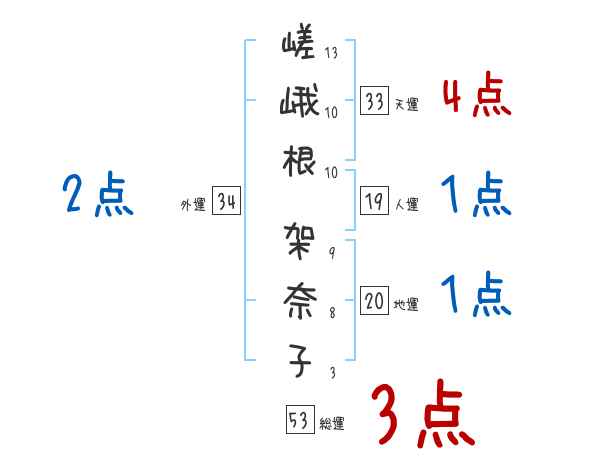 人運![]() | 嵯峨根架奈子さんの人運は19画の1つ星!優れた才能を持ちますが、協調性が足りないことも。周りの人と協力する事を意識しましょう。 性格や才能などを表す2番目に重要な運勢です。人間関係や協調性、社会的な成功に影響します。主に20歳から50歳ぐらいまでの中年期の運勢を表します。 |
