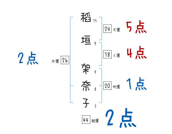 総運![]() | 稻垣架奈子さんの総運は44画の2つ星!誠実で慎重な性格。物事を考えすぎないように注意しましょう。 あなたの人生を表す1番重要な運勢です。生涯を通じて影響する総合運となり、主に50歳以降の晩年期に影響を及ぼします。 |