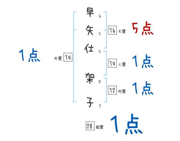 総運![]() | 早矢仕架子さんの総運は28画の1つ星!家庭環境に注意。スポーツで活躍できる能力があるかも。 あなたの人生を表す1番重要な運勢です。生涯を通じて影響する総合運となり、主に50歳以降の晩年期に影響を及ぼします。 |