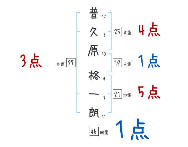 外運![]() | 普久原柊一朗さんの外運は27画の3つ星!頭脳明晰だが強情で摩擦が多い傾向。孤立に注意。 生活面を象徴する運勢です。外部から受ける影響力を表し、結婚運、家庭運や職場、環境への順応性を表します。 |