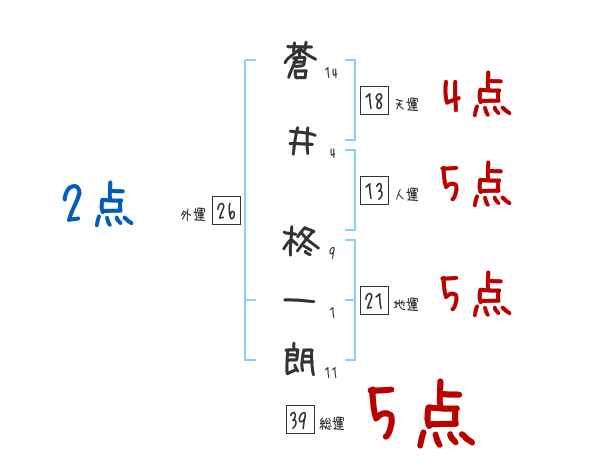 総運![]() | 蒼井柊一朗さんの総運は39画の5つ星!社交性に優れ人望が厚い。人の上に立ち成功する。 あなたの人生を表す1番重要な運勢です。生涯を通じて影響する総合運となり、主に50歳以降の晩年期に影響を及ぼします。 |