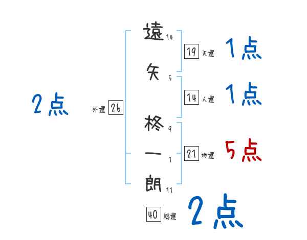 外運![]() | 遠矢柊一朗さんの外運は26画の2つ星!波瀾万丈かも。信頼できる人を大事にしましょう。 生活面を象徴する運勢です。外部から受ける影響力を表し、結婚運、家庭運や職場、環境への順応性を表します。 |