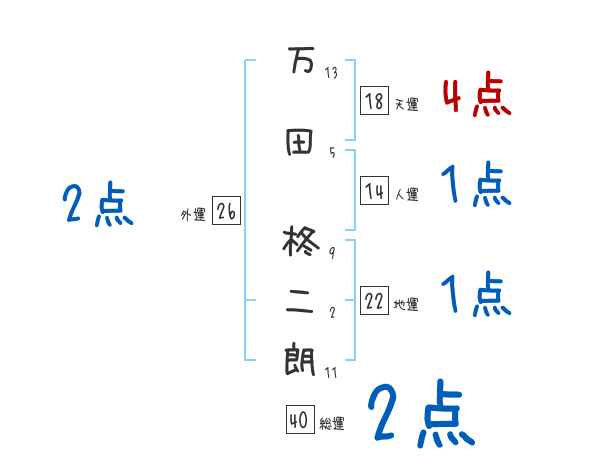 外運![]() | 万田柊二朗さんの外運は26画の2つ星!波瀾万丈かも。信頼できる人を大事にしましょう。 生活面を象徴する運勢です。外部から受ける影響力を表し、結婚運、家庭運や職場、環境への順応性を表します。 |