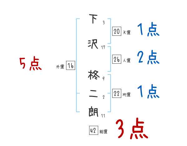 地運![]() | 下沢柊二朗さんの地運は22画の1つ星!努力することが苦手ないっぽう手先が器用。芸術性にも優れる。 個性を表す基礎的な運勢です。性格形成や対人関係、行動力など家庭環境に影響されます。主に誕生してから20歳くらいまでの若年期の運勢を表します。 |
