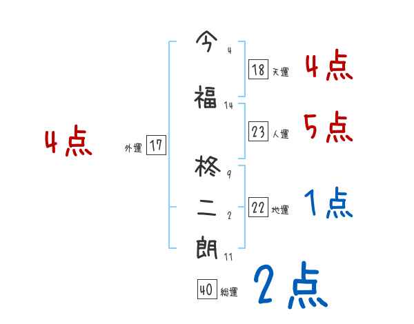 人運![]() | 今福柊二朗さんの人運は23画の5つ星!想像力に優れ活力がある。一代で成功し名誉を手に入れる。 性格や才能などを表す2番目に重要な運勢です。人間関係や協調性、社会的な成功に影響します。主に20歳から50歳ぐらいまでの中年期の運勢を表します。 |