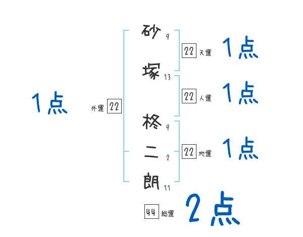 外運![]() | 砂塚柊二朗さんの外運は22画の1つ星!努力することが苦手ないっぽう手先が器用。芸術性にも優れる。 生活面を象徴する運勢です。外部から受ける影響力を表し、結婚運、家庭運や職場、環境への順応性を表します。 |