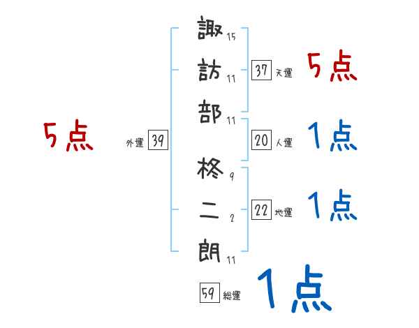 総運![]() | 諏訪部柊二朗さんの総運は59画の1つ星!意志の弱さであきらめることが多いかも。粘り強さが必要。 あなたの人生を表す1番重要な運勢です。生涯を通じて影響する総合運となり、主に50歳以降の晩年期に影響を及ぼします。 |