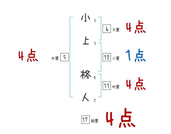 天運![]() | 小上柊人さんの天運は6画の4つ星!慎重な努力家で信頼を得る。誠実な精神で向上心に優れる。 家系が持つ宿命的な運勢を表します。祖先から受け継いだ苗字ですので自分の力が及びません。家柄を象徴します。 |