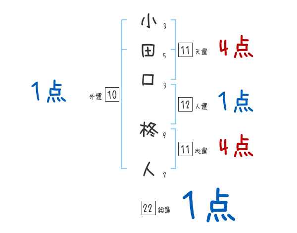総運![]() | 小田口柊人さんの総運は22画の1つ星!努力することが苦手ないっぽう手先が器用。芸術性にも優れる。 あなたの人生を表す1番重要な運勢です。生涯を通じて影響する総合運となり、主に50歳以降の晩年期に影響を及ぼします。 |