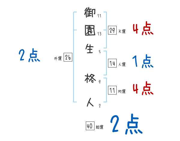 外運![]() | 御園生柊人さんの外運は26画の2つ星!波瀾万丈かも。信頼できる人を大事にしましょう。 生活面を象徴する運勢です。外部から受ける影響力を表し、結婚運、家庭運や職場、環境への順応性を表します。 |