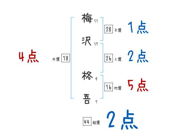 天運![]() | 梅沢柊吾さんの天運は28画の1つ星!家庭環境に注意。スポーツで活躍できる能力があるかも。 家系が持つ宿命的な運勢を表します。祖先から受け継いだ苗字ですので自分の力が及びません。家柄を象徴します。 |