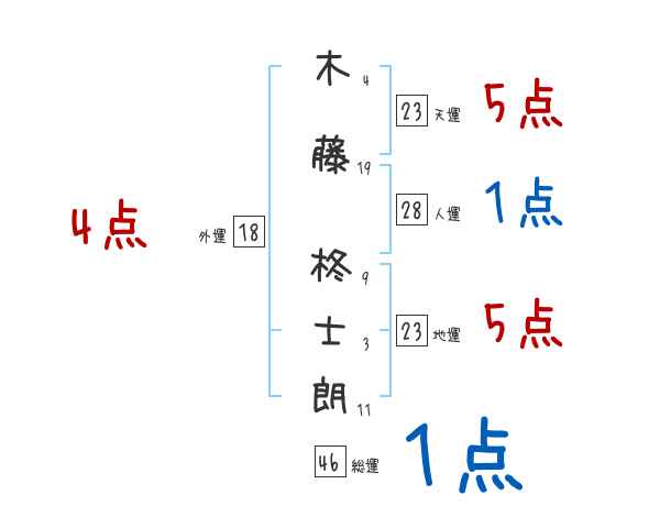 天運![]() | 木藤柊士朗さんの天運は23画の5つ星!想像力に優れ活力がある。一代で成功し名誉を手に入れる。 家系が持つ宿命的な運勢を表します。祖先から受け継いだ苗字ですので自分の力が及びません。家柄を象徴します。 |