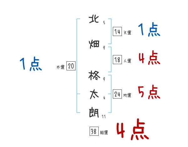 天運![]() | 北畑柊太朗さんの天運は14画の1つ星!人に対して優しいがストレスを溜め込みがち。人間関係のトラブルを避けるよう気をつけましょう。 家系が持つ宿命的な運勢を表します。祖先から受け継いだ苗字ですので自分の力が及びません。家柄を象徴します。 |