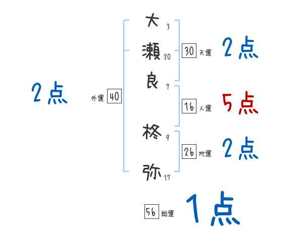 人運![]() | 大瀬良柊弥さんの人運は16画の5つ星!人望が厚く大きく発展する。逆転成功が見える。 性格や才能などを表す2番目に重要な運勢です。人間関係や協調性、社会的な成功に影響します。主に20歳から50歳ぐらいまでの中年期の運勢を表します。 |