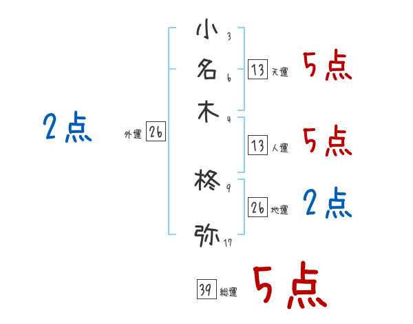 総運![]() | 小名木柊弥さんの総運は39画の5つ星!社交性に優れ人望が厚い。人の上に立ち成功する。 あなたの人生を表す1番重要な運勢です。生涯を通じて影響する総合運となり、主に50歳以降の晩年期に影響を及ぼします。 |