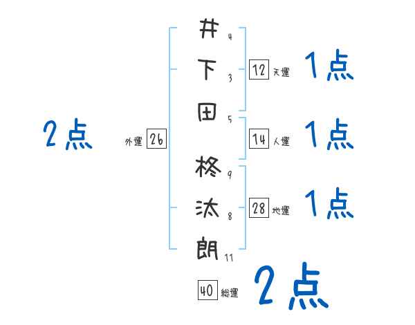 地運![]() | 井下田柊汰朗さんの地運は28画の1つ星!家庭環境に注意。スポーツで活躍できる能力があるかも。 個性を表す基礎的な運勢です。性格形成や対人関係、行動力など家庭環境に影響されます。主に誕生してから20歳くらいまでの若年期の運勢を表します。 |
