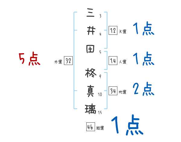 外運![]() | 三井田柊真璃さんの外運は32画の5つ星!柔軟性があり成功する。チャンスが多く金運が良い。 生活面を象徴する運勢です。外部から受ける影響力を表し、結婚運、家庭運や職場、環境への順応性を表します。 |