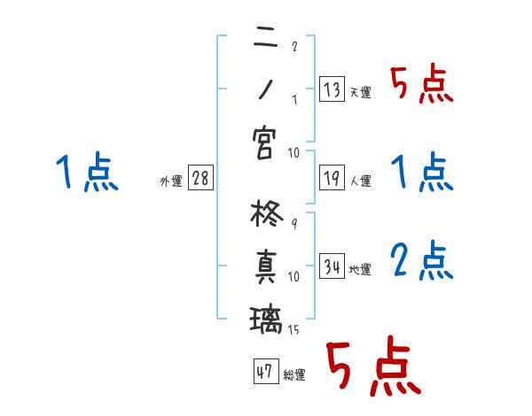 総運![]() | 二ノ宮柊真璃さんの総運は47画の5つ星!実力が開花し発展する円満な人生。財に恵まれる。 あなたの人生を表す1番重要な運勢です。生涯を通じて影響する総合運となり、主に50歳以降の晩年期に影響を及ぼします。 |