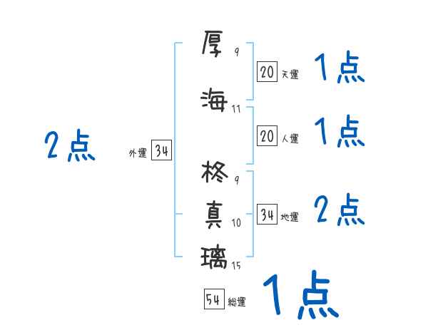 総運![]() | 厚海柊真璃さんの総運は54画の1つ星!トラブルが多いかも。周りをよく見て協調して過ごしましょう。 あなたの人生を表す1番重要な運勢です。生涯を通じて影響する総合運となり、主に50歳以降の晩年期に影響を及ぼします。 |