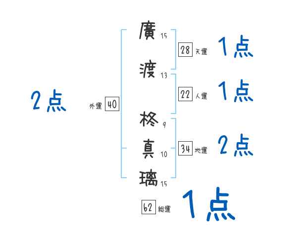 人運![]() | 廣渡柊真璃さんの人運は22画の1つ星!努力することが苦手ないっぽう手先が器用。芸術性にも優れる。 性格や才能などを表す2番目に重要な運勢です。人間関係や協調性、社会的な成功に影響します。主に20歳から50歳ぐらいまでの中年期の運勢を表します。 |