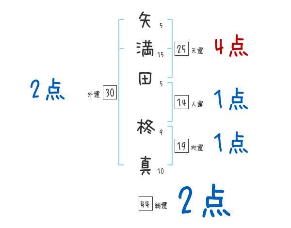 総運![]() | 矢満田柊真さんの総運は44画の2つ星!誠実で慎重な性格。物事を考えすぎないように注意しましょう。 あなたの人生を表す1番重要な運勢です。生涯を通じて影響する総合運となり、主に50歳以降の晩年期に影響を及ぼします。 |