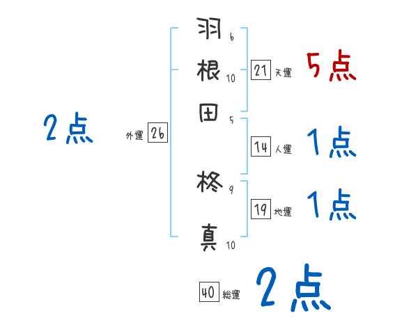 外運![]() | 羽根田柊真さんの外運は26画の2つ星!波瀾万丈かも。信頼できる人を大事にしましょう。 生活面を象徴する運勢です。外部から受ける影響力を表し、結婚運、家庭運や職場、環境への順応性を表します。 |