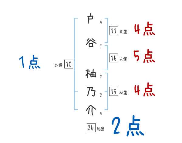 | 天運  | 戸谷柚乃介さんの天運は11画の4つ星!着実に富や地位を得る幸運な人生。家系が持つ宿命的な運勢を表します。祖先から受け継いだ苗字ですので自分の力が及びません。家柄を象徴します。 |