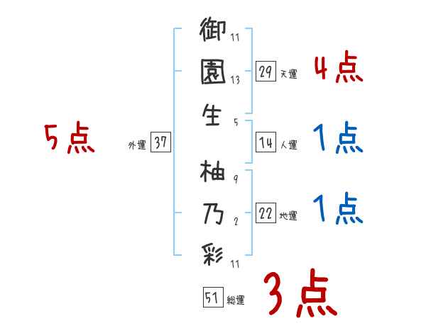 総運![]() | 御園生柚乃彩さんの総運は51画の3つ星!変化が激しく、危険に注意。堅実な性格。 あなたの人生を表す1番重要な運勢です。生涯を通じて影響する総合運となり、主に50歳以降の晩年期に影響を及ぼします。 |