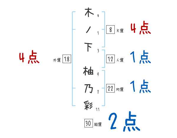 総運![]() | 木ノ下柚乃彩さんの総運は30画の2つ星!浮き沈みの激しさに注意しましょう。 あなたの人生を表す1番重要な運勢です。生涯を通じて影響する総合運となり、主に50歳以降の晩年期に影響を及ぼします。 |