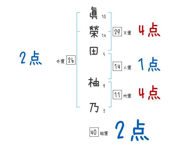 外運![]() | 眞榮田柚乃さんの外運は26画の2つ星!波瀾万丈かも。信頼できる人を大事にしましょう。 生活面を象徴する運勢です。外部から受ける影響力を表し、結婚運、家庭運や職場、環境への順応性を表します。 |