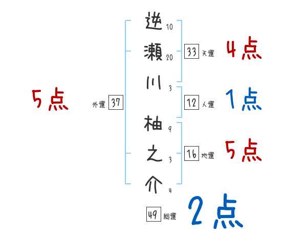 天運![]() | 逆瀬川柚之介さんの天運は33画の4つ星!権力志向でプライドが高い。勇気があり運を切り開き成功する。 家系が持つ宿命的な運勢を表します。祖先から受け継いだ苗字ですので自分の力が及びません。家柄を象徴します。 |