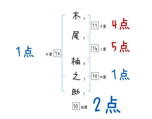 人運![]() | 木尾柚之助さんの人運は16画の5つ星!人望が厚く大きく発展する。逆転成功が見える。 性格や才能などを表す2番目に重要な運勢です。人間関係や協調性、社会的な成功に影響します。主に20歳から50歳ぐらいまでの中年期の運勢を表します。 |